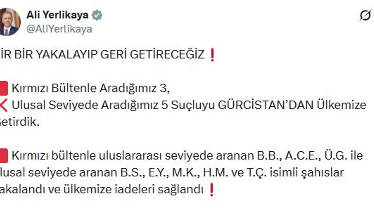 ANKARA, (DHA)- İÇİŞLERİ Bakanı Ali Yerlikaya, kırmızı bültenle aranan 3, ulusal seviyede aranan 5 suçlunun Gürcistan'da yakalanıp yurda getirildiğini duyurdu.