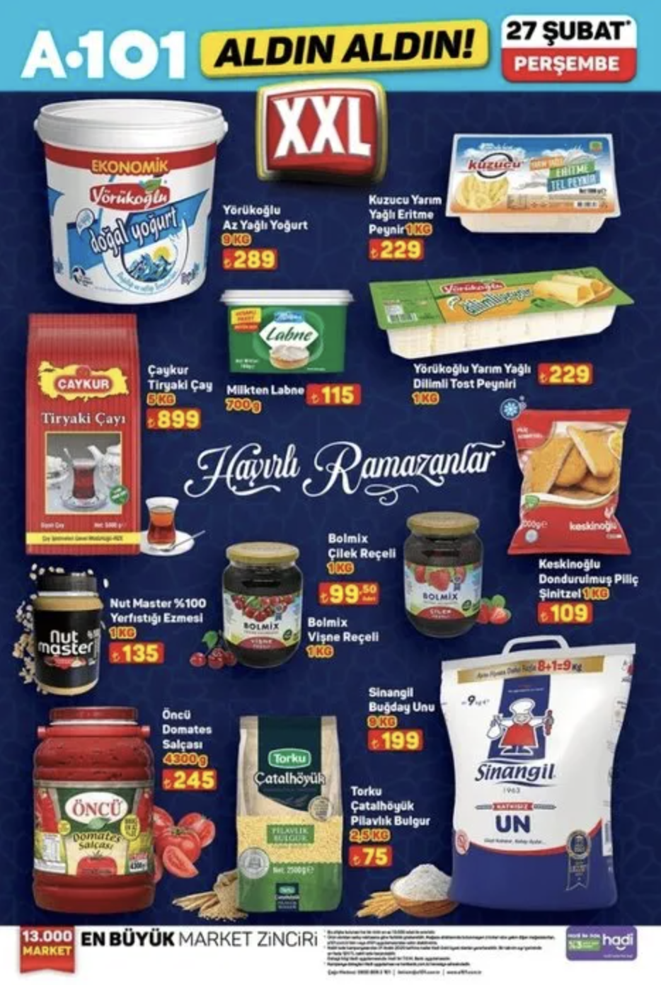 A101, 27 Şubat itibarıyla aktüel broşüründeki Ramazan ürünlerini satışa çıkaracak. Bu ürünlerin büyük bir kısmı uygun fiyatlarıyla dikkat çekiyor. Ayrıca, gıda dışı ürünlerde de Ramazan’a özel kampanyalar bulunuyor.