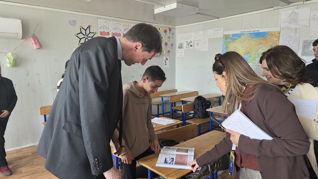 AB Türkiye Delegasyonu ve üye ülke temsilcilerinden oluşan heyet, AB desteğiyle deprem bölgesindeki çalışmaları incelemek için saha gezisi yaptı. AB Türkiye Delegasyonu Geçici Maslahatgüzarı Jurgis Vilčinskas, Finlandiya'nın Ankara Büyükelçisi Pirkko Hämäläinen, Litvanya'nın Türkiye Büyükelçisi Marius Janukonis ile AB üyesi ülkelerin ve ilgili bakanlıkların temsilcilerinin yer aldığı heyet, ilk olarak Altınözü Devlet Hastanesi'nde incelemelerde bulundu. Heyet, ardından Yenişehir Konteyner Kenti'ni ziyaret ederek burada yürütülen çalışmalar hakkında yetkililerden bilgi aldı. Heyetin bir sonraki durağı ise Büyükdalyan 2 Konteyner Kenti ile Derince Şehit Coşkun Akşit İlkokulu oldu. Deprem sonrası bölgede yürütülen iyileştirme ve yeniden yapılanma sürecini yerinde inceleyen heyet, barınma alanları ve eğitim faaliyetlerine ilişkin değerlendirmelerde bulundu. Ziyaretlerde, sahadaki mevcut durum, ihtiyaçlar ve yürütülen projeler ele alındı. (DHA)