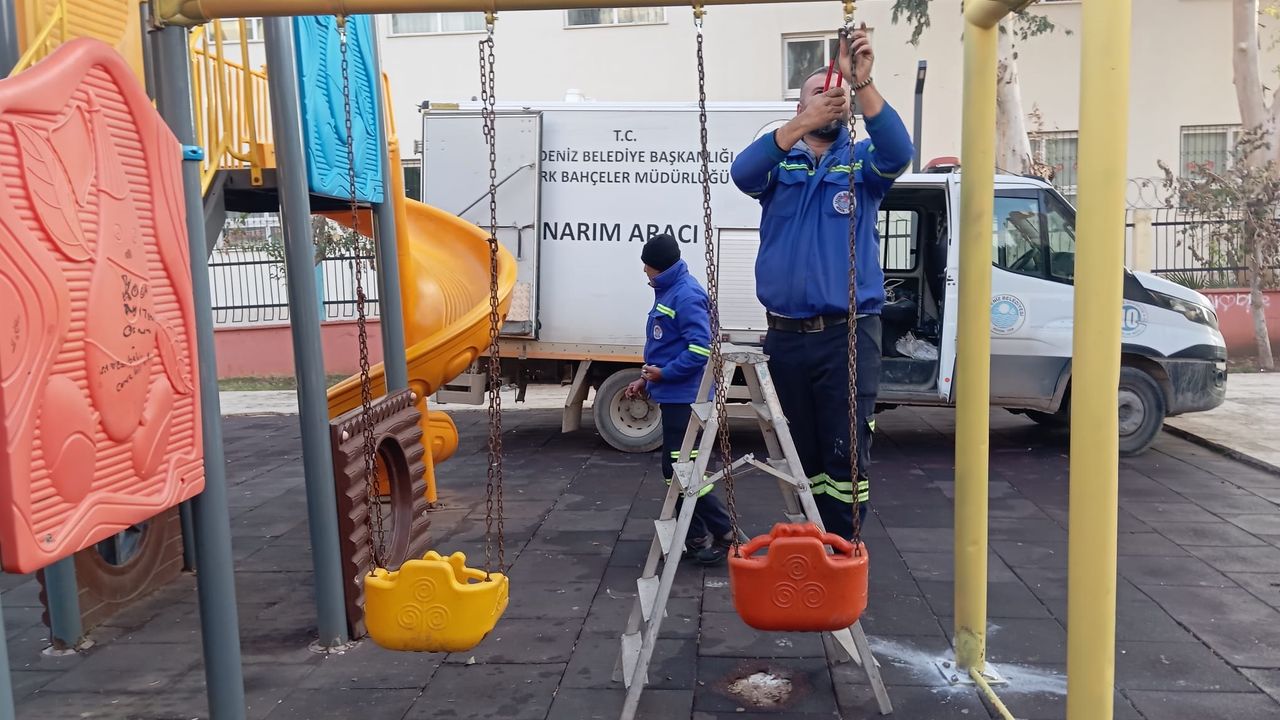 Akdeniz Belediyesi Park ve Bahçeler Müdürlüğü ekipleri tarafından parklarda bulunan ağaçlar mevsimine uygun şekilde budanırken, zarar gören kamelyalar, oturma grupları ve aydınlatma sistemleri onarılıyor. Zamanla yıpranan çocuk oyun grupları ise yenileriyle değiştirilerek çocukların güvenli ortamlarda oyun oynaması sağlanıyor. Bu kapsamda ilçe genelinde 12 parkta bulunan çocuk oyun grupları tamamen yenilenerek vatandaşların hizmetine sunuldu. Her yaştan vatandaşın ortak kullanım alanı olan park ve yeşil alanlarda yürütülen çalışmalarla, hem kent estetiğinin korunması hem de sosyal yaşamın desteklenmesi hedefleniyor. Çalışmalara ilişkin değerlendirmede bulunan Akdeniz Kaymakamı ve Belediye Başkan Vekili Zeyit Şener, 'Parklarımız, çocuklarımızın güvenle oyun oynadığı, büyüklerimizin dinlendiği ve mahalle kültürünün yaşatıldığı önemli sosyal alanlardır. Akdeniz Belediyesi olarak vatandaşlarımızın daha temiz, güvenli ve konforlu alanlarda vakit geçirebilmesi için park ve yeşil alanlarımızda bakım ve yenileme çalışmalarını sürdürüyoruz. İlçemizin her noktasında yaşam kalitesini artırmaya yönelik hizmetlerimize kararlılıkla devam edeceğiz' dedi.