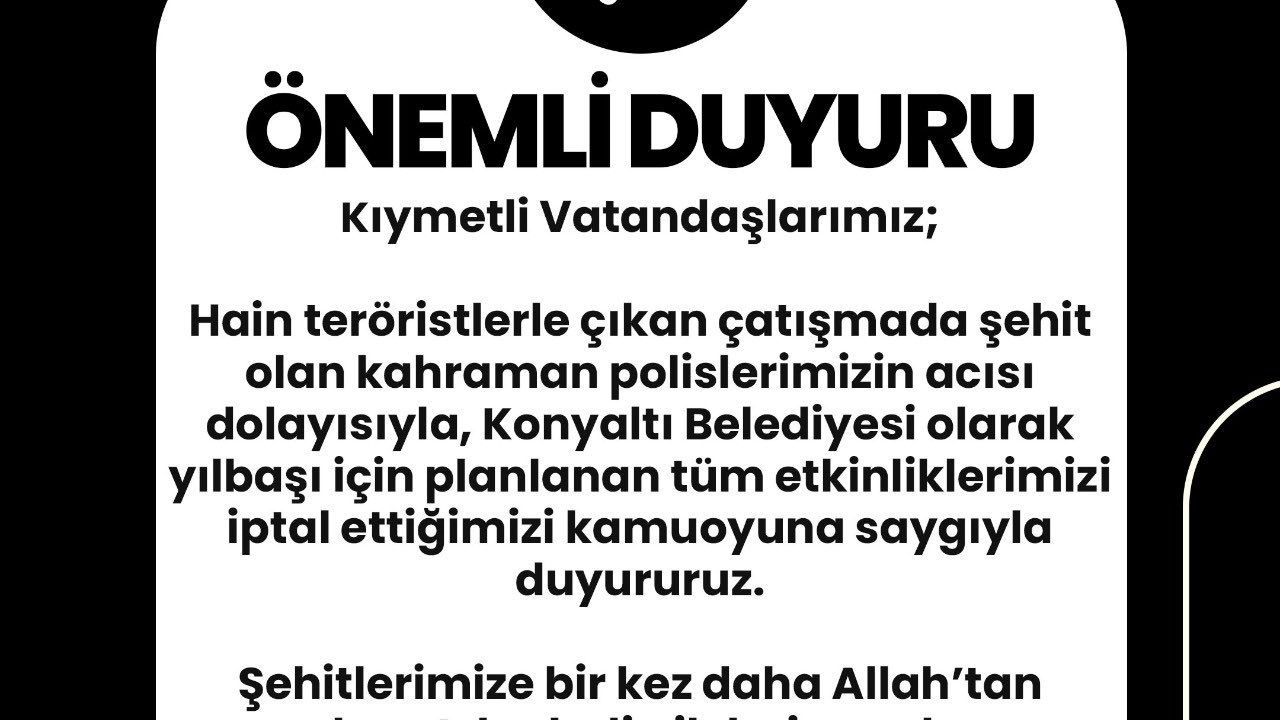Antalya'nın merkez ilçelerinden Konyaaltı Belediyesi'nden yapılan açıklamada, 'Hain teröristlerle çıkan çatışmada şehit olan kahraman polislerimizin acısı dolayısıyla, Konyaaltı Belediyesi olarak yılbaşı için planlanan tüm etkinliklerimizi iptal ettiğimizi kamuoyuna saygıyla duyururuz' denildi.