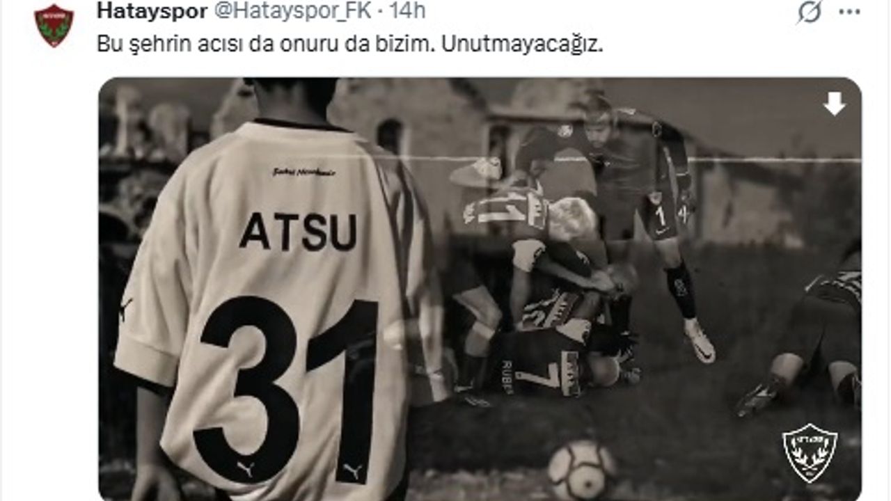 Samim SELÇUK/ HATAY, (DHA)- 1'inci Lig ekiplerinden Atakaş Hatayspor, 6 Şubat asrın felaketinde kaybedilenleri 'Unutmayacağız' başlığıyla anmak adına bir video yayınladı. Paylaşımda, depremde hayatını kaybeden Atsu'ya da yer verildi.