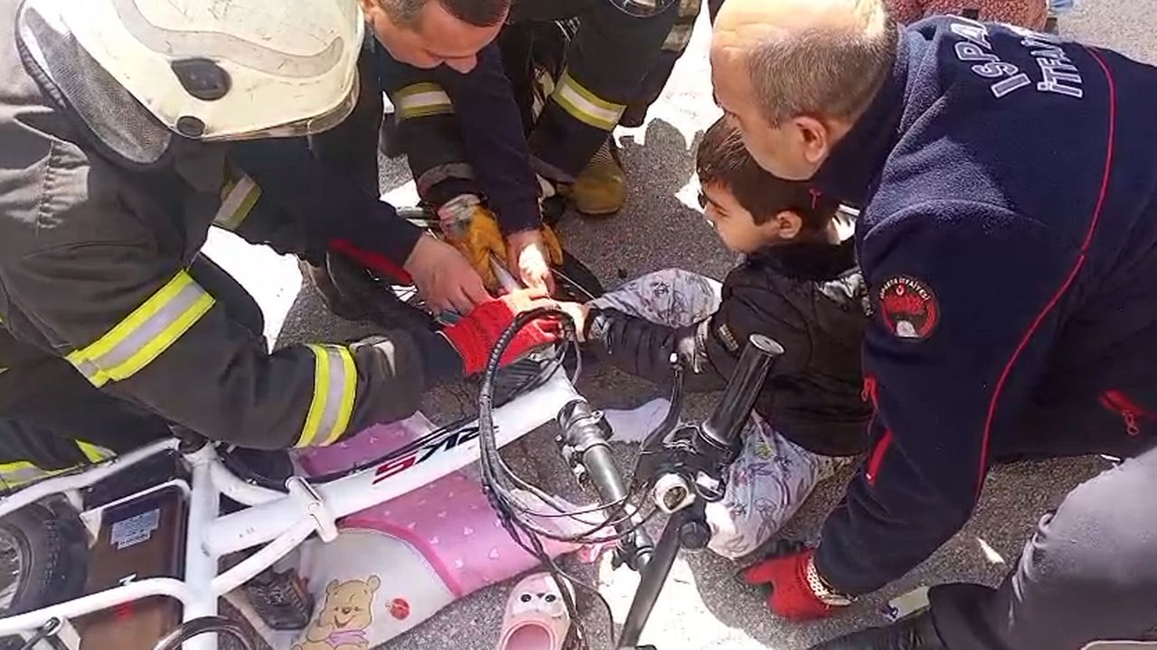 Olay, Fatih Mahallesi 4628 sokakta meydana geldi. Metin A.'nın ayağı bindiği bisiklete sıkıştı. Çevredekilerin yardımına geldiği çocuk için Isparta Belediyesi İtfaiye Müdürlüğü ekiplerine haber verildi. Olay yerine gelen ekipler müdahale ederek Metin A.'yı kurtardı. Metin A.'nın sağlık durumunun iyi olduğu öğrenildi. (DHA)