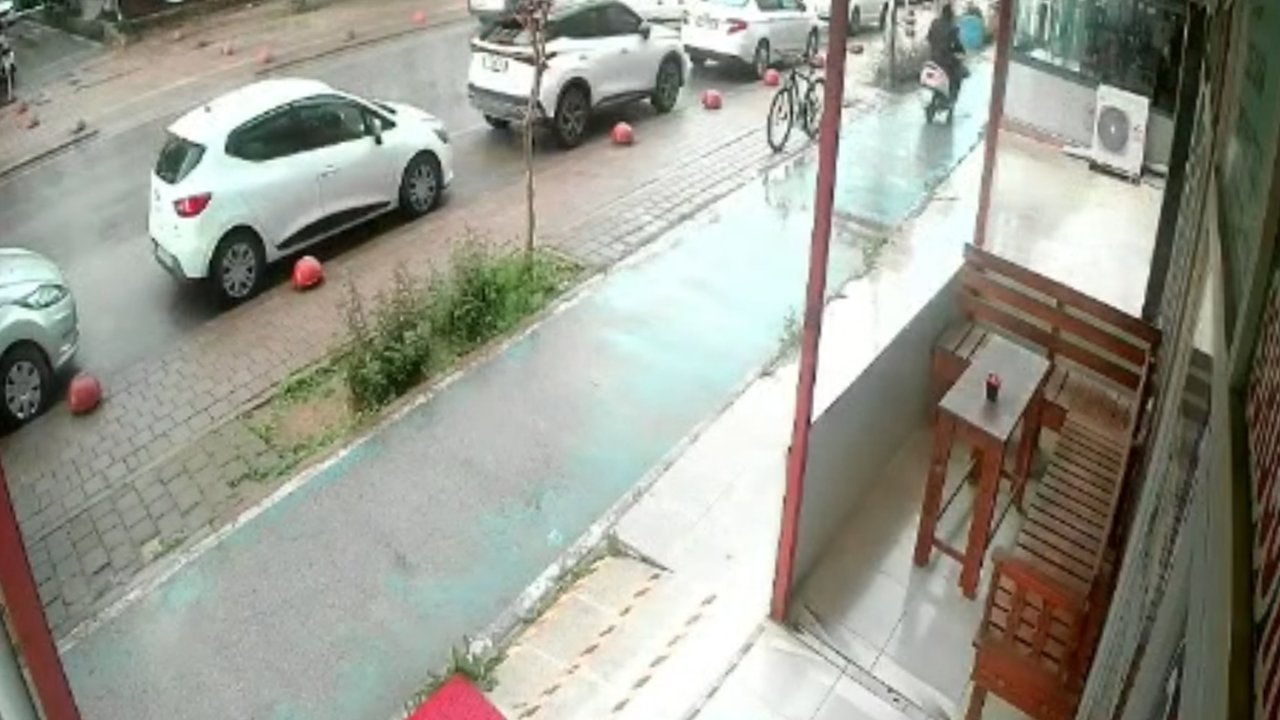Hırsızlık anı güvenlik kamerasına yansıdı. Görüntüde bisikletle ilerleyen şüphelinin park halindeki motosikleti fark ettikten sonra birkaç metre ileriden geri döndüğü, bisikleti bırakıp çalıştırdığı motosikletle olay yerinden uzaklaştığı anlar yer aldı. (DHA)