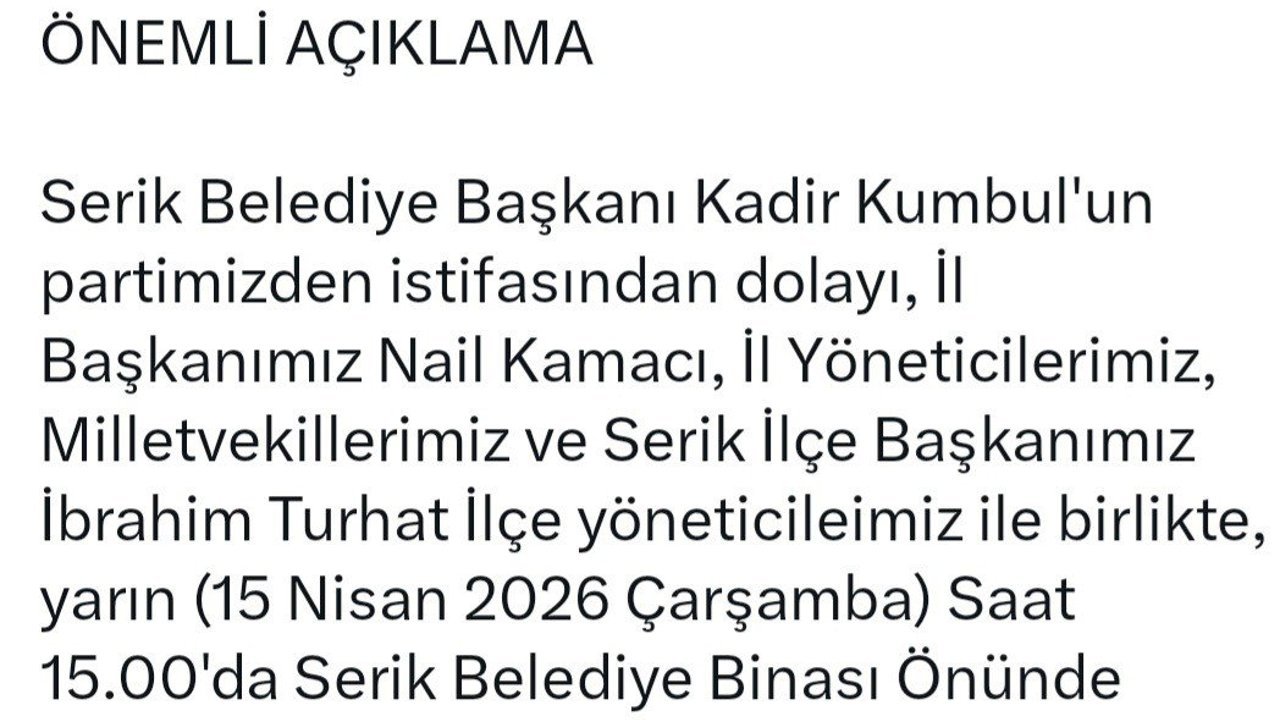 CHP Antalya İl Başkanlığı'nın sanal medya hesabından yapılan paylaşımda Serik Belediye Başkanı Kadir Kumbul'un CHP'den istifa ettiği belirtilerek 'Serik Belediye Başkanı Kadir Kumbul'un partimizden istifasından dolayı, İl Başkanımız Nail Kamacı, il yöneticilerimiz, milletvekillerimiz ve Serik İlçe Başkanımız İbrahim Tunalı, ilçe yöneticilerimizle birlikte yarın saat 15.00'da Serik Belediye binası önünde basın açıklaması gerçekleştirilecektir. Tüm halkımızın katılımlarını bekliyoruz' denildi. (DHA)
