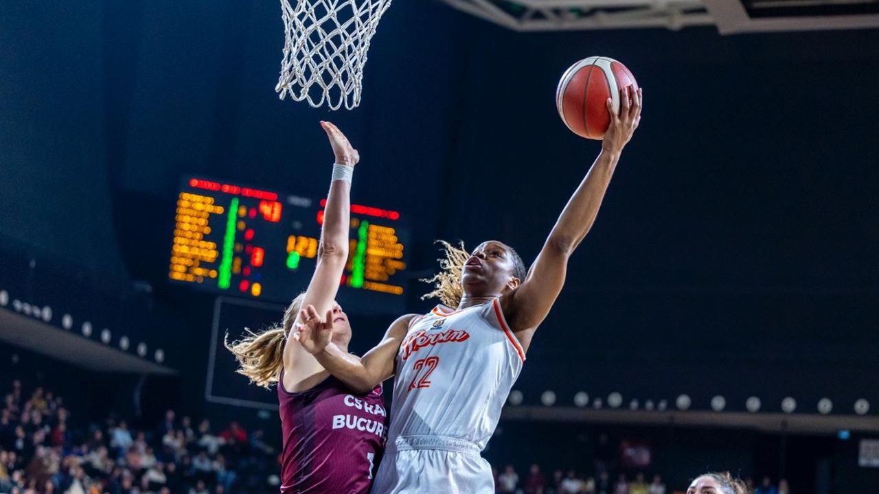 BASKETBOL Kadınlar Eurocup 1'inci Tur rövanş maçında Çimsa ÇBK Mersin, Romanya ekibi Rapid Bucuresti'yi konuk etti. Karşılaşmayı 95-87'lik skorla kazanan ÇBK Mersin, son 16 turuna yükseldi. (DHA)