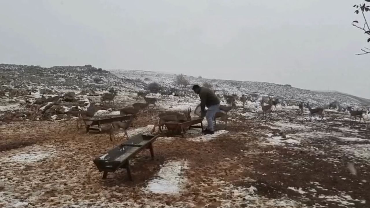 İlçedeki Hatay Dağ Ceylanı Üretim Merkezi'ndeki koruma çalışmalarıyla sayıları her geçen yıl artan dağ ceylanları, 4 yıl aradan sonra yeniden yağan karla buluştu. Doğal yaşam alanlarında kar altında beslenen ceylanlar görüntülendi. (DHA)