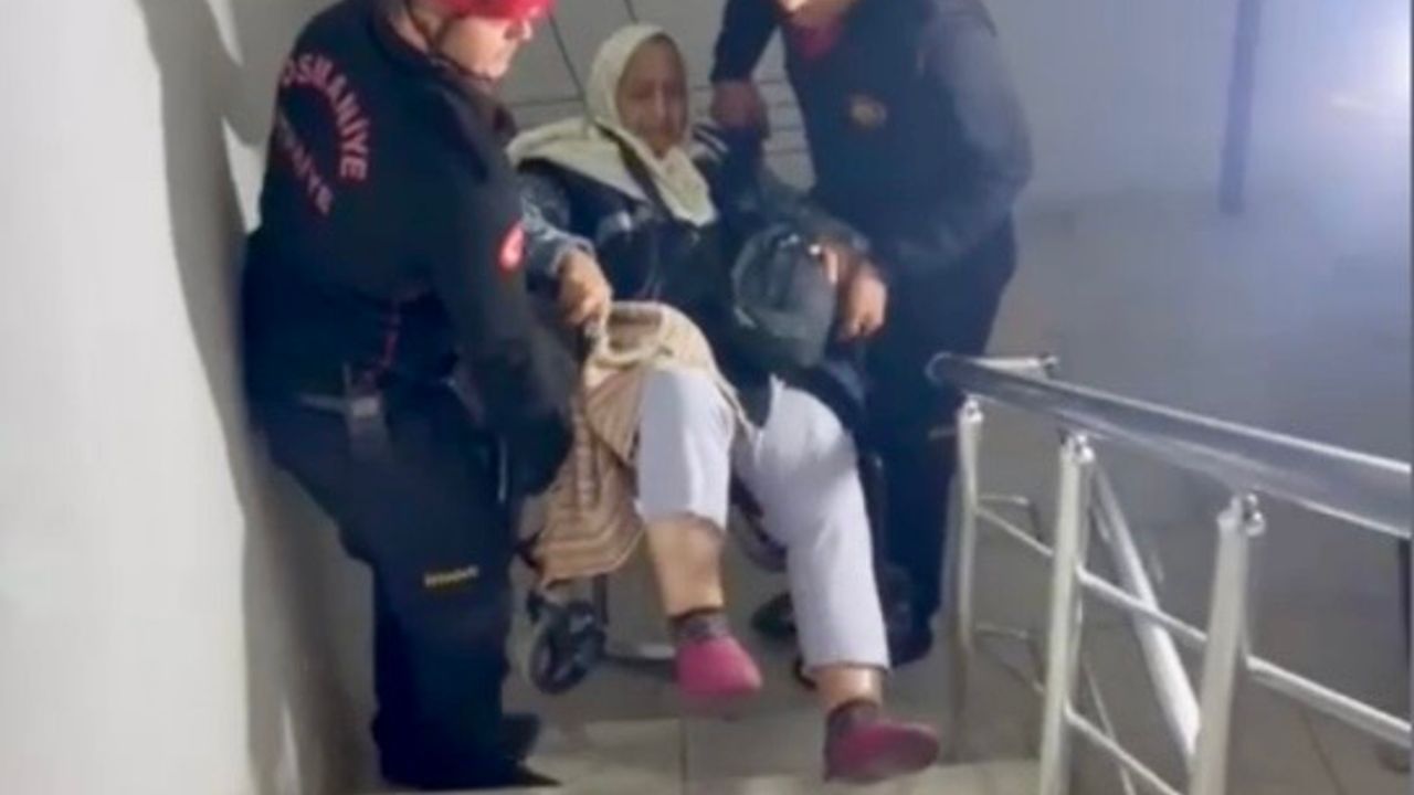 Tekerlekli sandalyede bulunan yaşlı kadın, iki itfaiye eri eşliğinde merdivenlerden taşınarak ikinci kattaki evine güvenli bir şekilde çıkarıldı. O anlarda bir kadın komşunun el feneriyle ekiplere ışık tutarak yardımcı olduğu görüldü.