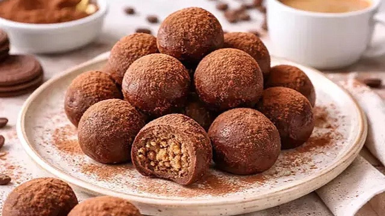 Karışımdan kaşık yardımıyla parçalar alın, avuç içinde yuvarlayarak toplar oluşturun. Servis tabağına dizin ve üzerine süzgeç yardımıyla kakao serpin. Daha yoğun aroma için ikinci bir kat kakao eklenebilir.