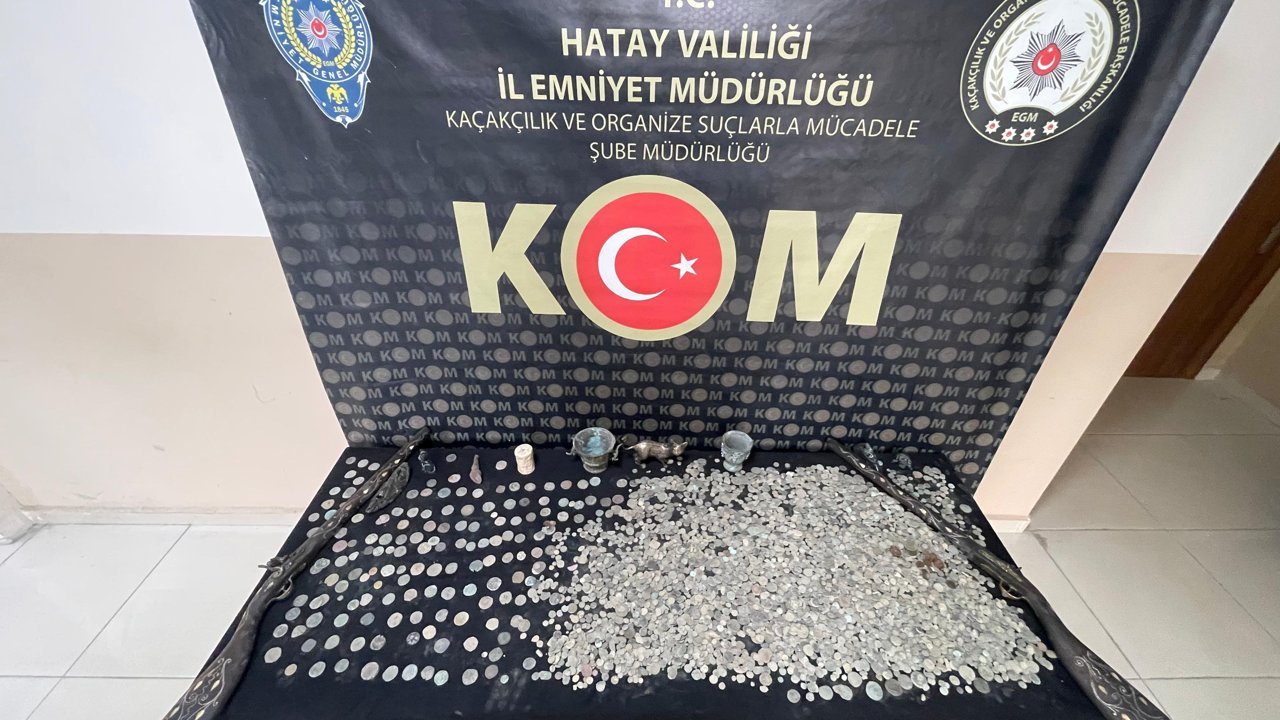 Hatay Emniyet Müdürlüğü görevlilerince, Antakya ilçesi Kardeşler Mahallesi İzmir Caddesi üzerinde durdurulan bir araçta yapılan aramada, 12 bin 767 adet Roma, Bizans, Hitit, Antiochia ve Makedonya İmparatorluğu dönemlerine ait olduğu değerlendirilen sikke, 300 adet çeşitli obje, 9 adet biblo/obje ve 2 adet 19. yüzyıla ait tüfek olmak üzere toplam 13 bin 78 adet tarihi eser niteliğinde materyal ele geçirildi. Olayla ilgili olarak Ö.E. ve İ.K. gözaltına alınarak soruşturma başlatıldı. (DHA)