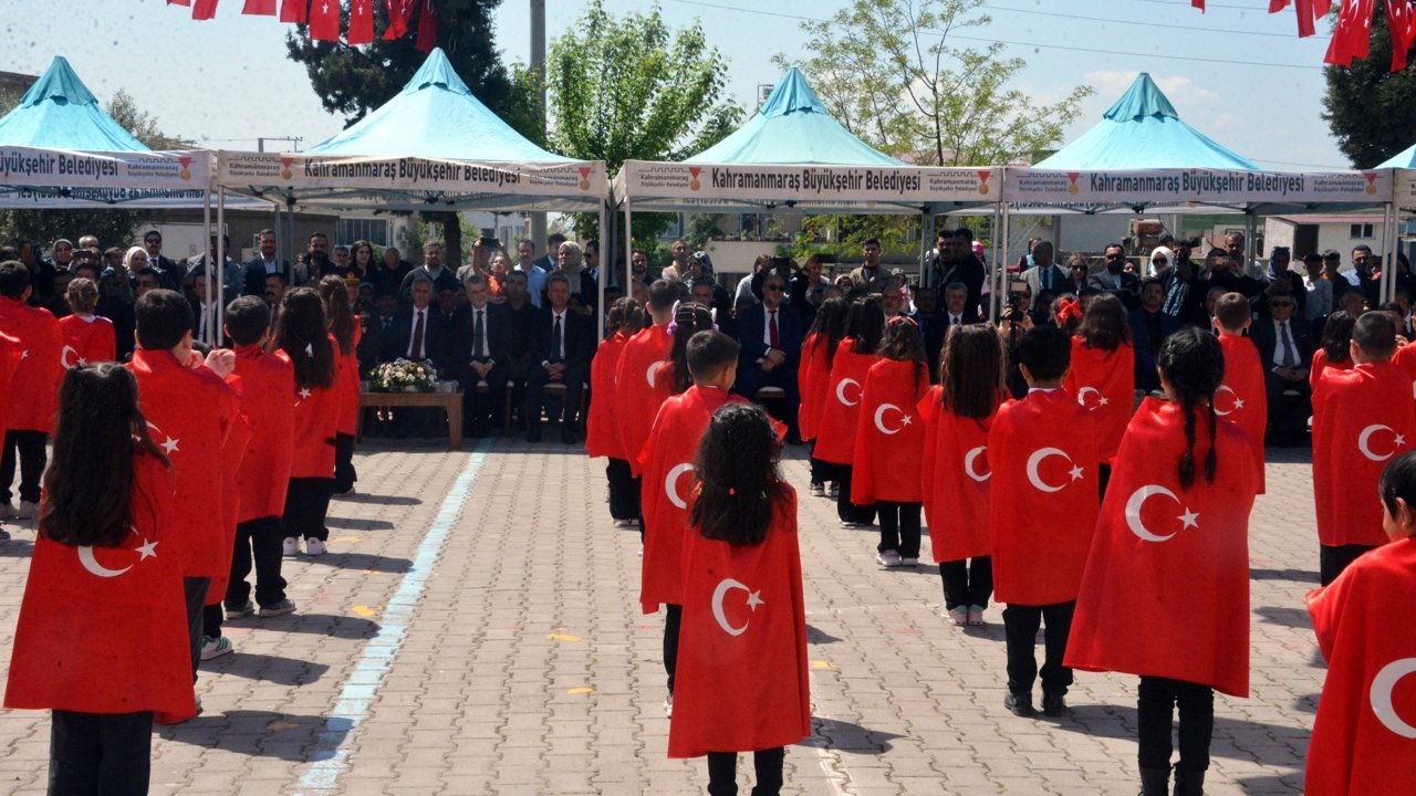 Burada konuşan Kahramanmaraş İl Milli Eğitim Müdürü Turan Akpınar, '15 Nisan 2026 tarihinde ilimiz Ayser Çalık Ortaokulu'nda meydana gelen menfur saldırıda 1 öğretmenimizi ve 8 evladımızı kaybetmenin derin üzüntüsünü bir kez daha ifade etmek istiyorum. Hayatını kaybeden öğretmenimize ve öğrencilerimize Allah'tan rahmet, kederli ailelerine ve aziz milletimize başsağlığı diliyorum. Aynı olayda yaralanan ve halen tedavi altında olan öğrencilerimize de acil şifalar temenni ediyorum. 23 Nisan 1920, milletimizin istiklal ve istikbal mücadelesinin milli irade çatısı altında birleştirdiği, egemenliğin kayıtsız şartsız millete ait olduğunun tüm dünyaya ilan edildiği tarihimizin en önemli dönüm noktalarından biridir. TBMM, yokluklar içinde verilen büyük bir mücadelenin, sarsılmaz bir inancın ve bağımsızlık uğruna ortaya konan eşsiz fedakarlığın timsalidir. Başta cumhuriyetimizin kurucusu Gazi Mustafa Kemal Atatürk olmak üzere TBMM'nin kuruluşunda emeği geçen tüm kahramanlarımızı, aziz şehitlerimizi ve gazilerimizi rahmet, minnet ve şükranla anıyorum' dedi. Konuşmanın ardından öğrenciler, 23 Nisan'ı anlatan şiirler okudu. (DHA)