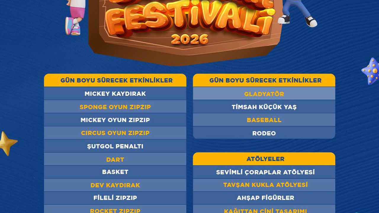 Gün boyu sürecek etkinliklerde; Mickey kaydırak, oyun zıp zıp, sirk temalı zıp zıp, şutgol penaltı, dart, basket, dev kaydırak, fileli zıp zıp, rocket zıp zıp, gladyatör parkuru, küçük yaş grubu için timsah oyun alanı ve rodeo gibi eğlenceli aktiviteler yer alacak. Festivalde ayrıca atölye çalışmaları da düzenlenecek. Sevimli Çoraplar Atölyesi, Tavşan Kukla Atölyesi, Ahşap Figürler, Kağıttan Çini Tasarım Atölyesi gibi yaratıcı çalışmalarla çocukların el becerileri ve hayal güçleri desteklenecek.