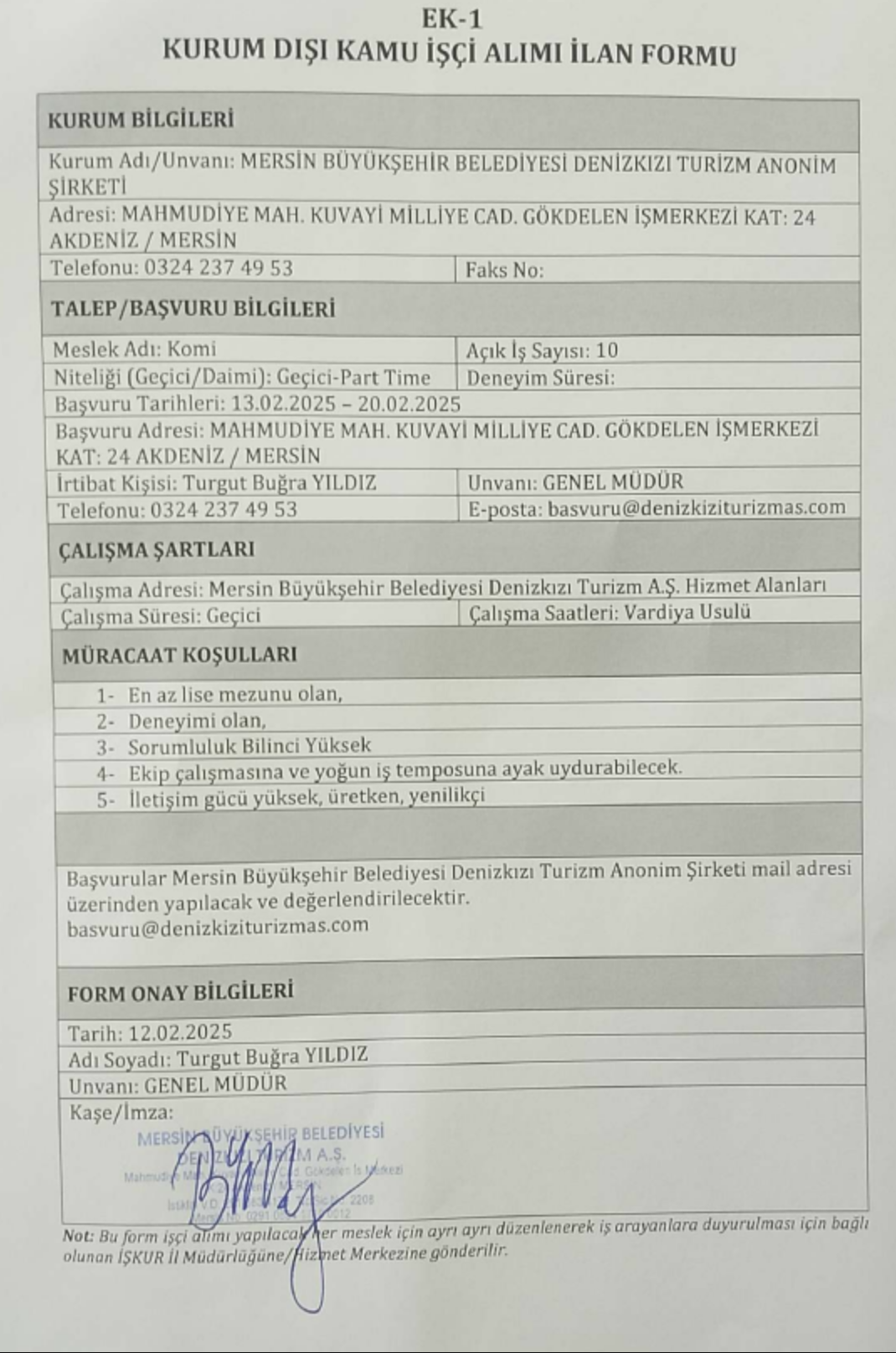 Mersin Büyükşehir Belediyesi’ne bağlı Denizkızı Turizm A.Ş. tarafından yayınlanan komi alımı ilanında, adaylarda aranan temel şartlar şu şekilde sıralanıyor: