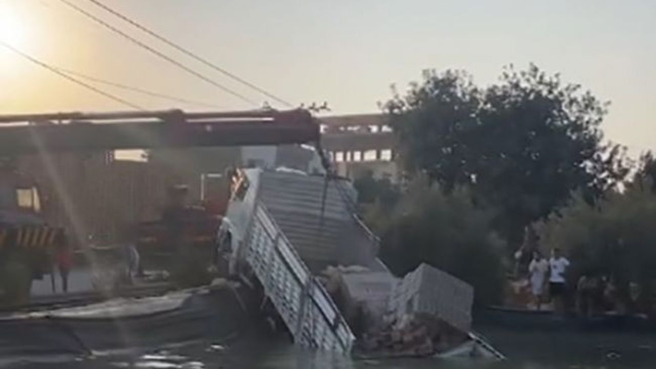 Mersin’in Erdemli ilçesi Üçtape Mahallesi’nde yokuş aşağı seyreden bir kamyonun freni patladı. Kontrolden çıkan araç, yol kenarındaki sulama havuzuna düştü ve suya gömüldü.