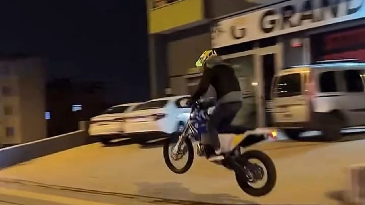 Yıldırım ilçesinde gece saatlerinde bir motosikletli, önce plakasız aracıyla tek teker üzerinde ilerleyerek trafiği tehlikeye attı. Motosikletli daha sonra aracı ile kaldırıma çıkıp, akrobasi hareketleri yaptı. O anlar, başka bir sürücü tarafından cep telefonuyla görüntülenirken; polis ekipleri, sürücüyü yakalamak için çalışma başlattı. (DHA)
