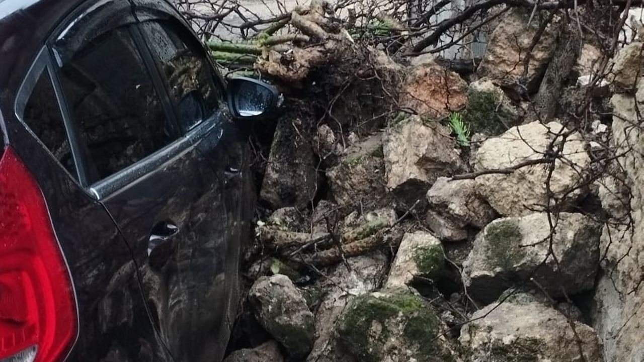 Çöken duvar, park halindeki bir otomobilin üzerine düştü. Olayda şans eseri yaralanan olmazken, araçta maddi hasar meydana geldi. (DHA)