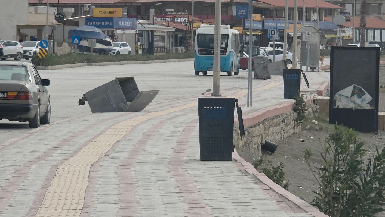 Alican GÜMÜŞ/HATAY, (DHA) - HATAY'ın Samandağ ilçesinde etkili olan rüzgar nedeniyle sahil bandında yer alan çöp konteynerleri, masa ve sandalyeler devrildi.