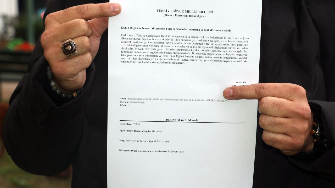 Tunahan KIR/ANTALYA, (DHA)- ANTALYA'da yaşayan Halit Mert, düğün ve nişanlardaki takı törenlerinde delinen, yere atılan Türk lirasının bu şekilde zarar görmesinin önlenmesi amacıyla Türkiye Büyük Millet Meclisi (TBMM) Dilekçe Komisyonu'na başvurdu.