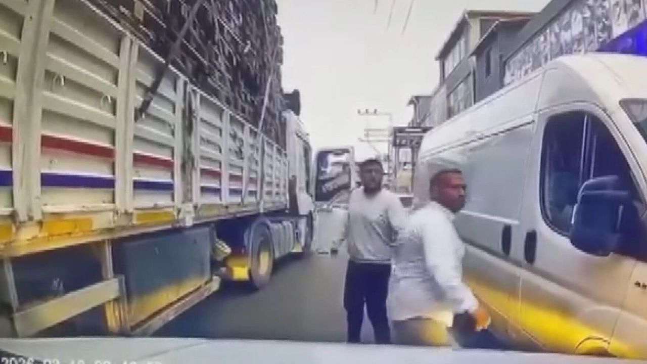 Olay, akşam saatlerinde Seyhan ilçesi Mehmet Akif Ersoy Caddesi'nde meydana geldi. TIR sürücüsü ile otomobil sürücüsü arasında trafikte yol verme nedeniyle tartışma çıktı. Tartışmanın büyümesi üzerine araçtan inen TIR şoförü ile yanındaki kişi, ellerinde bıçakla otomobile doğru koştu. Şüpheliler, otomobilin üzerine çıkarak araca zarar verdi. O anlar, otomobilin yol kamerası tarafından kaydedildi.