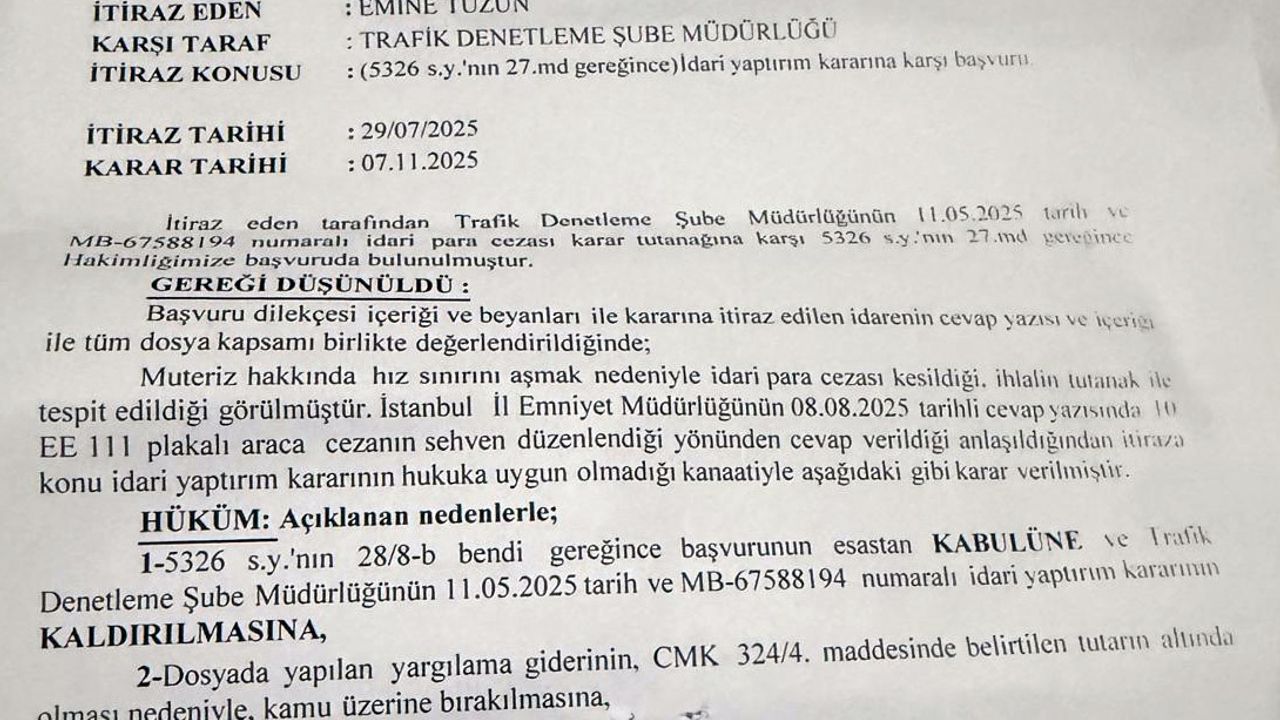 Aynı plakaya İstanbul Trafik Denetleme Şube Müdürlüğü tarafından 2024 yılı Mayıs ayında aşırı hız cezası kesildiğini de kaydeden Emine Tüzün, 'Bu cezaya da itiraz ettik. 1 yıl sonra İstanbul Anadolu 3. Sulh Ceza Mahkemesi sehven yazıldığı gerekçesiyle cezayı iptal etti. Tam 'kurtulduk' derken, icra dairesi bu kez başka bir alacağın tahsili için ödeme emri çıkarmış' diye konuştu.