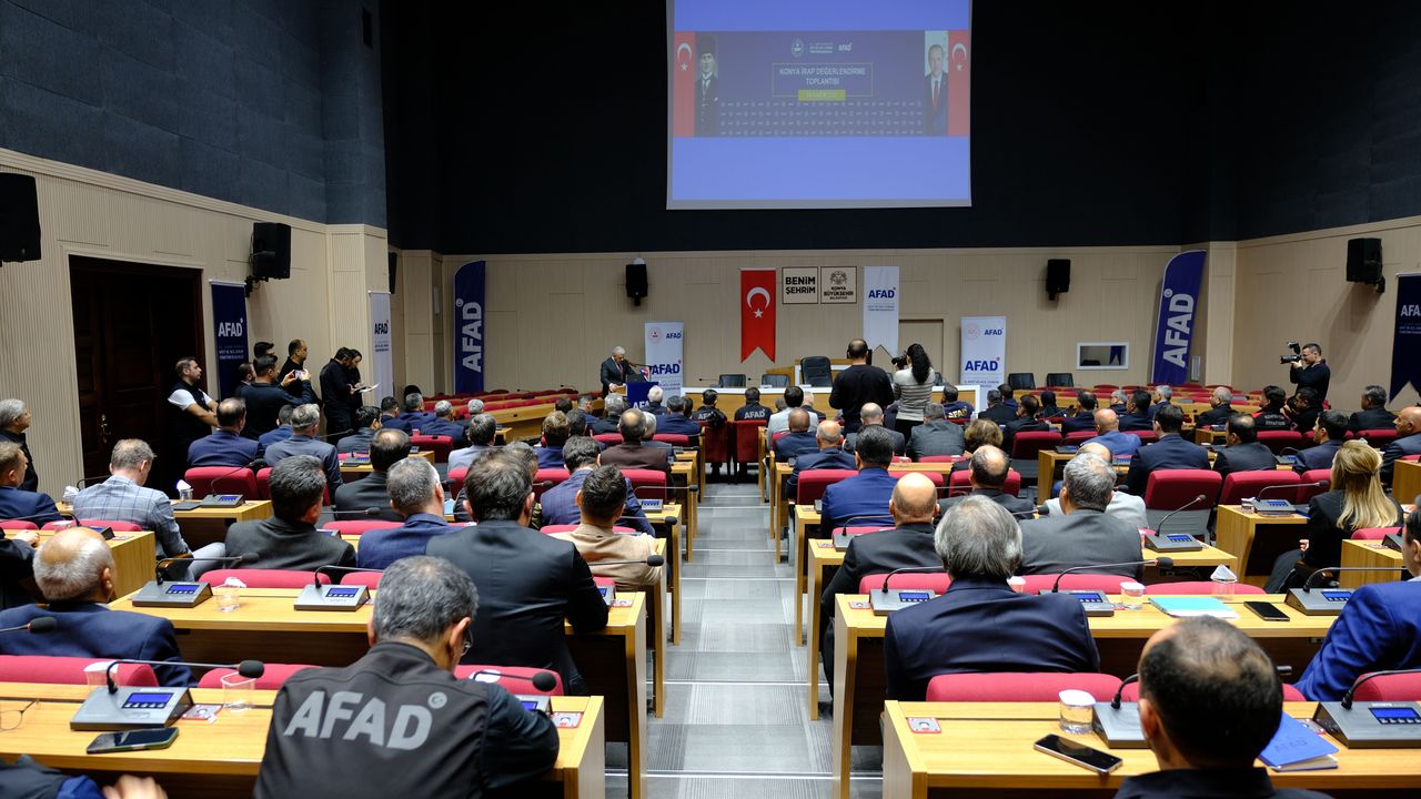Konya Büyükşehir Belediyesi Fen İşleri Daire Başkanlığı salonunda, Konya Valisi İbrahim Akın ve AFAD Deprem ve Risk Azaltma Genel Müdürü Prof. Dr. Orhan Tatar başkanlığında, İl Afet Risk Azaltma Planı (İRAP) değerlendirme toplantısı gerçekleşti. Prof. Dr. Tatar, "Türkiye'de 16 bin 701 eylem planı var. Bu ciddi bir rakam. Bunlar tabii sürekli güncellenebilecek rakamlar. Bunların içerisinde bizim kırmızı eylem diye adlandırdığımız, bir an önce bertaraf edilmesi gereken, bir an önce çözülmesi gereken eylemler var. Bunlar da 2 bin 418 tane. Konya'mızın da toplam eylemi sayısı çok fazla. 624 tane diye biliyorum. İstanbul ve Samsun'dan sonra 3’üncü il durumunda. Bunların özellikle kurumlarımız tarafından yeniden gözden geçirilmesi, yeniden elden geçirilmesi ve belki kompakt hale getirilmesi son derece büyük önem taşıyor" diye konuştu.