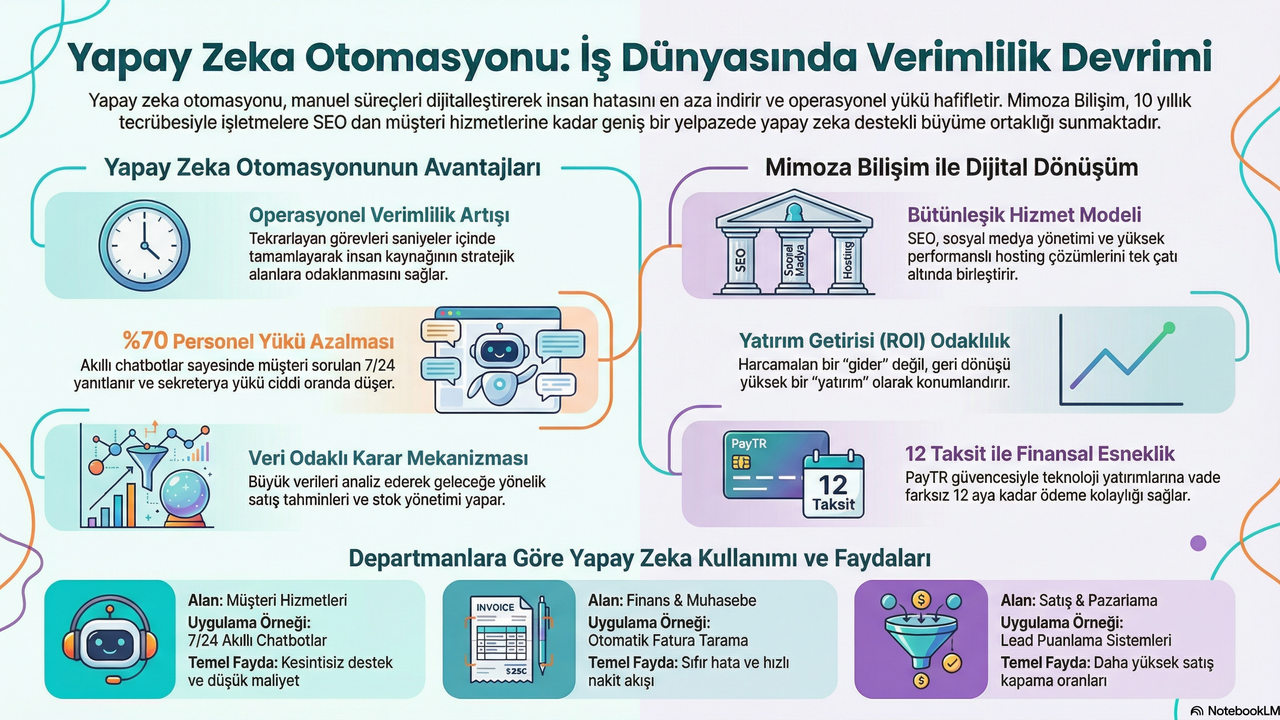 Bu yazıda, yapay zeka otomasyonunun işletmelere sağladığı somut faydaları ve sektörün öncüsü Mimoza Bilişim'in sunduğu yenilikçi çözümleri detaylıca inceleyeceğiz.