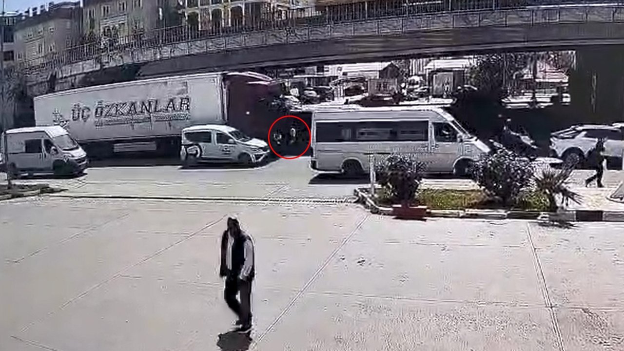 Diğer yandan, kaza anı, çevredeki bir iş yerinin güvenlik kamerasına yansıdı. Görüntüde; TIR'ın hareket halindeyken yol kenarında bulunan Durdu Aldemir'e çarptığı, kadının aracın altında kaldığı anlar yer aldı. (DHA)